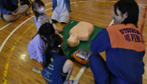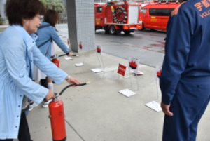 AEDや消火器などの操作を学んだり、消火用のバケツ手渡しリレーなど行ったりと楽しく訓練を行いました。
